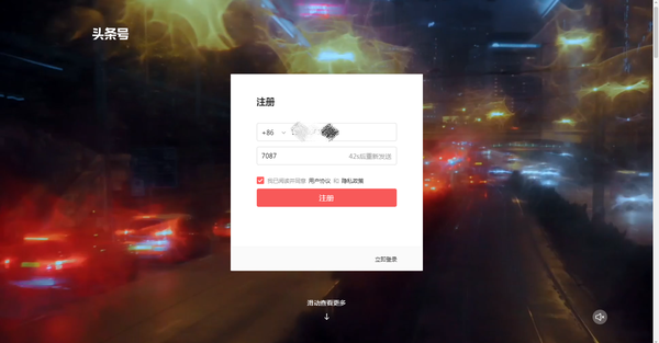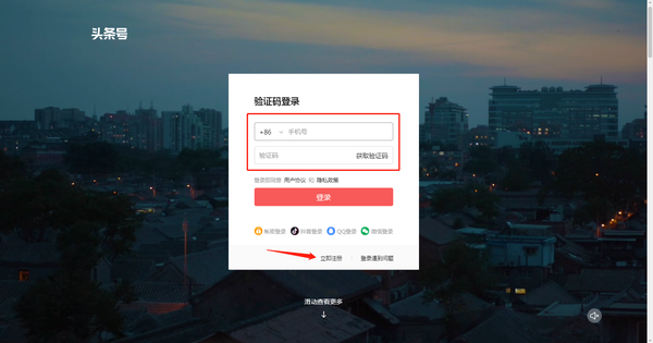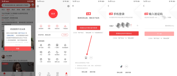[打开今日头条] ⏩ [登录] ⏩ [选择手机注册] ⏩ [手机登录] ⏩ [输入验证码]