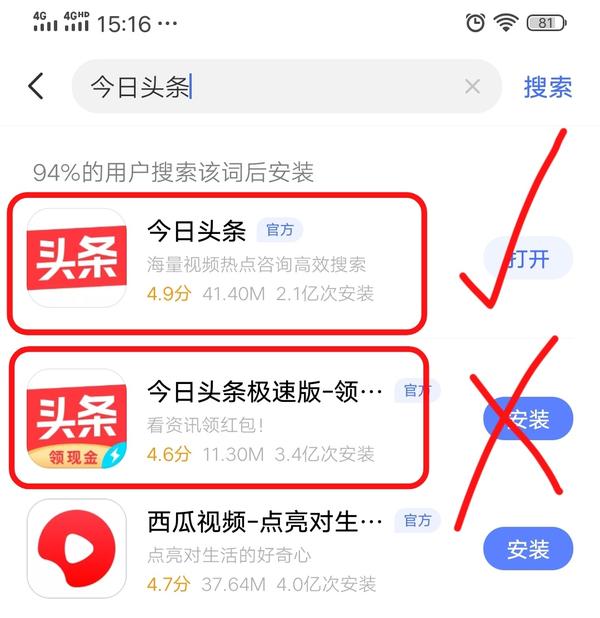 手机端①手机应用商店搜索【今日头条】下载安装