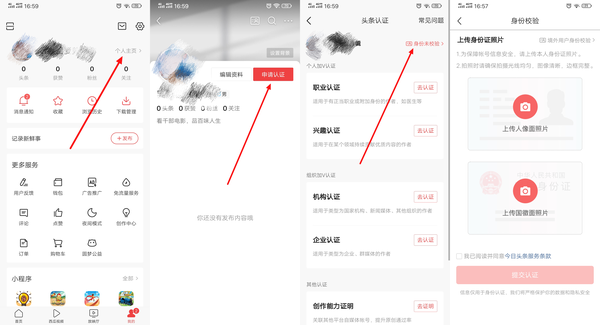 [进入个人主页] ⏩ [红色按钮申请认证] ⏩ [身份未校验] ⏩ [上传身份证张反面完成认证]