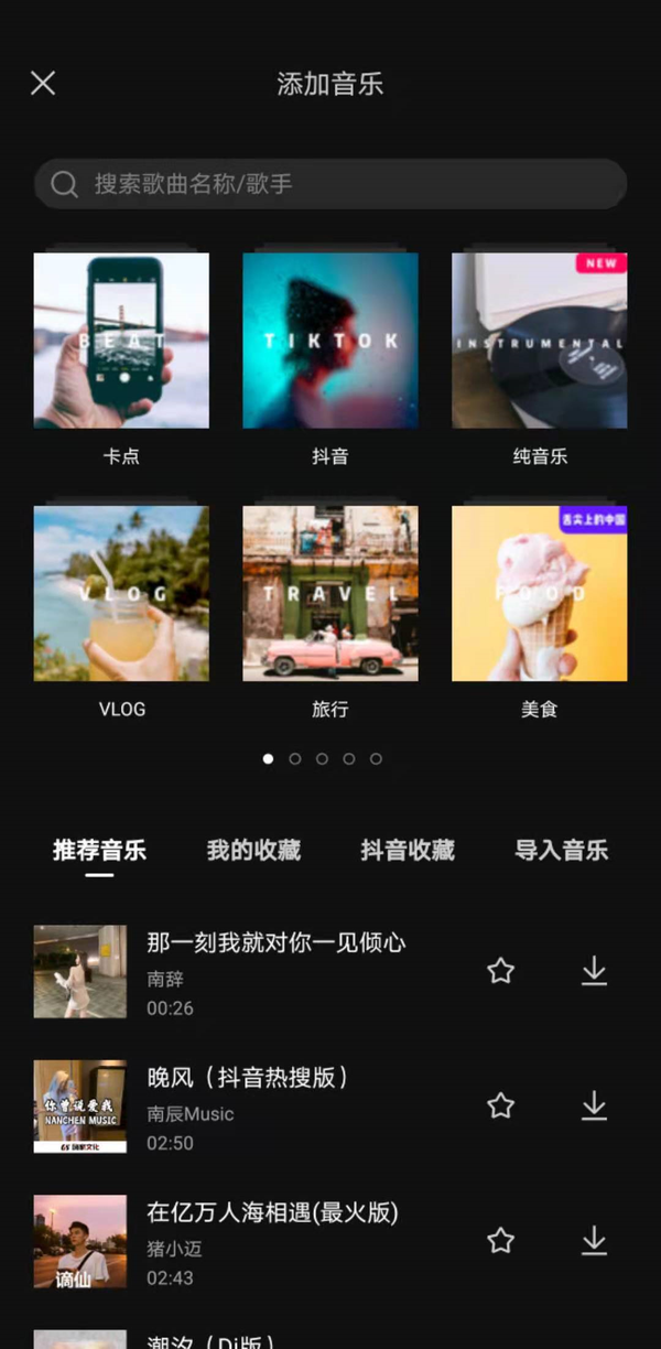 音乐方面可以直接到剪映下载,抖音热歌,经典老歌里面都有,直接下载就行。