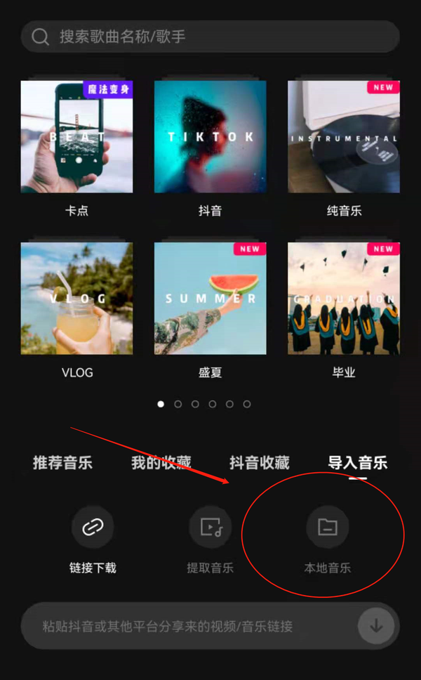 ④:导入音频素材,点击“音频”→“音乐”,可以直接在剪映搜索你想要的歌曲,也可以使用你下载好的素材。