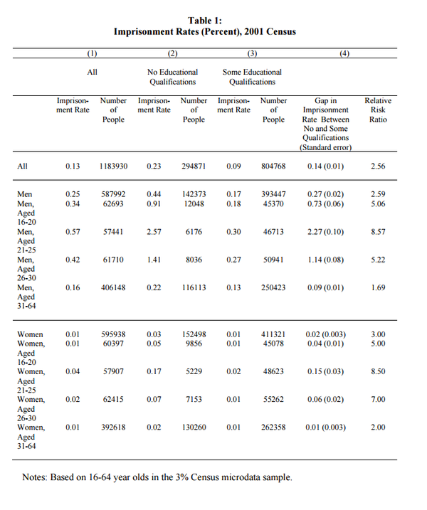 这份统计数据来自答主本校,显示的是英国的犯罪率与受教育程度关系,最后一行显示相关率,数值越大表明相关性越高,可见在21-25岁的成年男子群体中,未受教育群体比受教育群体受徒刑率高出8.57倍,犯罪乃至受徒刑可以说是道德水平低下的极致体现了,8.57倍的差距意味着什么不言而喻。