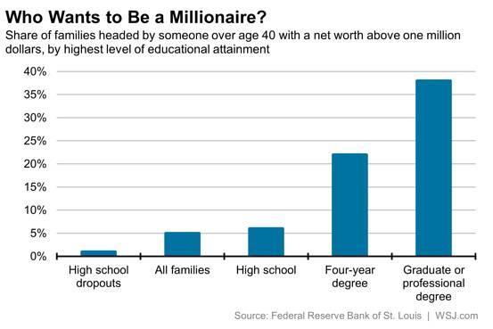 硕士学历以上家庭比高中学历家庭的百万富翁比例高30倍,请感受一下。