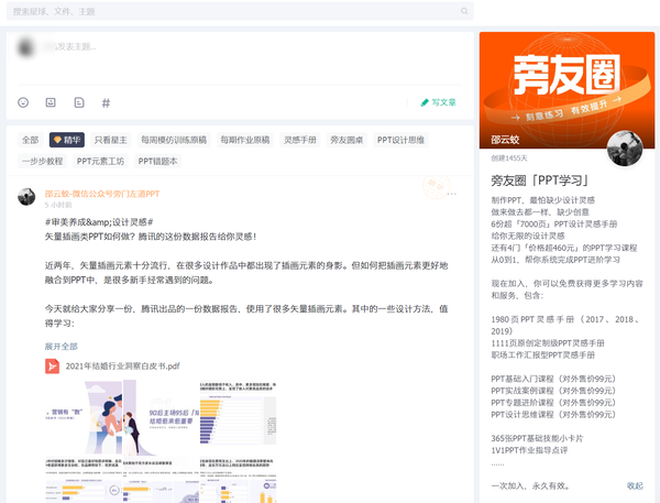 可以找一些PPT相关的社群,比如,知识星球中的【旁友圈】: