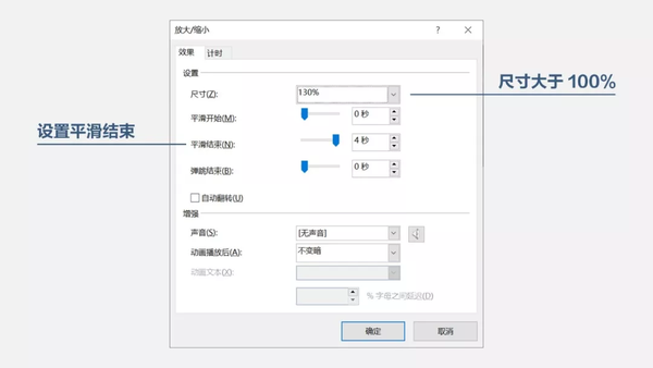 在效果选项中,只要将尺寸调整为 100% 以上就会出现放大效果,这里我将尺寸设置为 130%。