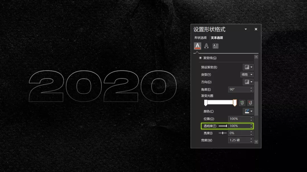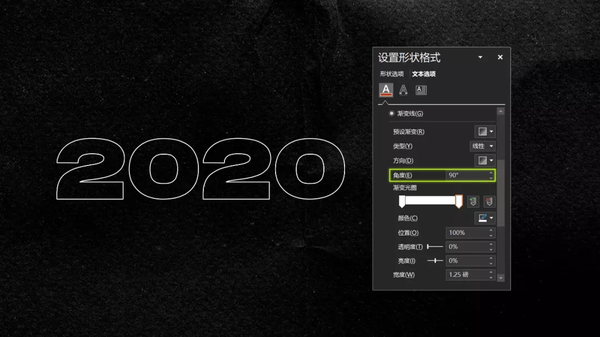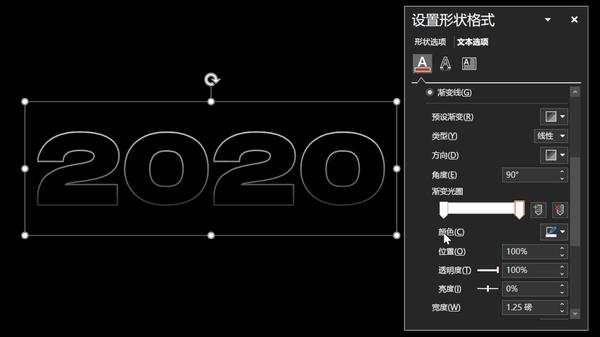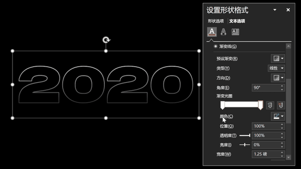 先设置文字无填充,轮廓为渐变线,角度 90°,且只保留两个白色渐变光圈: