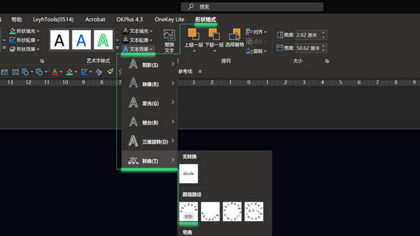 这时候,可以先选中想要倾斜的字体,然后依次点击 形状格式 > 文本效果 > 转换。