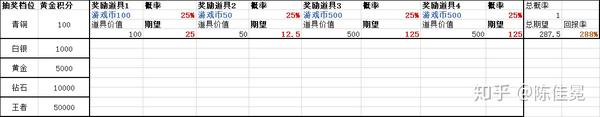 上述,我列出一个基本抽奖的设计思路,青铜档位的抽奖需要消耗100的黄金积分(假设我采用黄金积分=游戏币,比例为1:1的设计话)