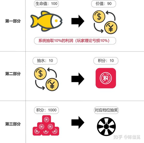 上述我们可以把整个黄金鱼变为黄金积分和游戏币保持他的一个相对平衡数值的模型,抽奖这一块我们再通过对物品的价值锚定以及概率控制,达到最终的平衡期望