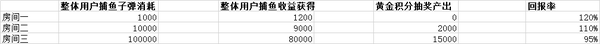 在添加黄金积分抽奖模块后,我们把黄金积分的产出同步到玩家打鱼的消耗和收获当中,即可得出实际房间中,整体大盘上所有玩家在这个房间的盈利情况