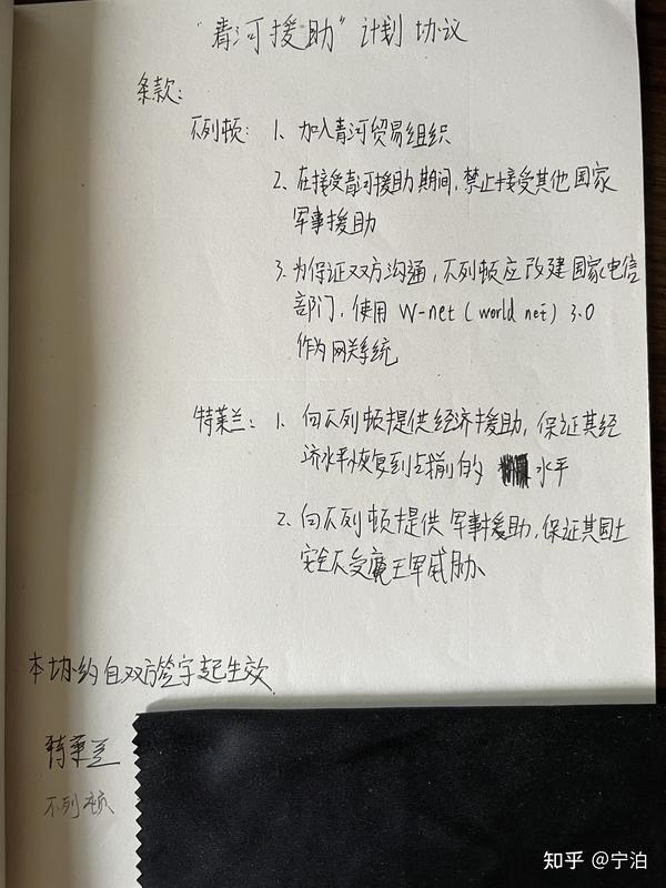 不列顿与特莱兰的协议,黑布遮挡部分是两国元首(玩家)的签字可以看到,协议第三条是关于网络系统的协定,这是魔王战争之后签订的协议,因为不列顿是魔王战争前夜加入的玩家,因此初始科技设定在了二战前水平,不具备网络。